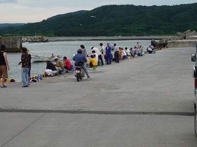 中でも北港という砂浜の近くの小さい港があるんですが、釣り人がびっちり並んでました。