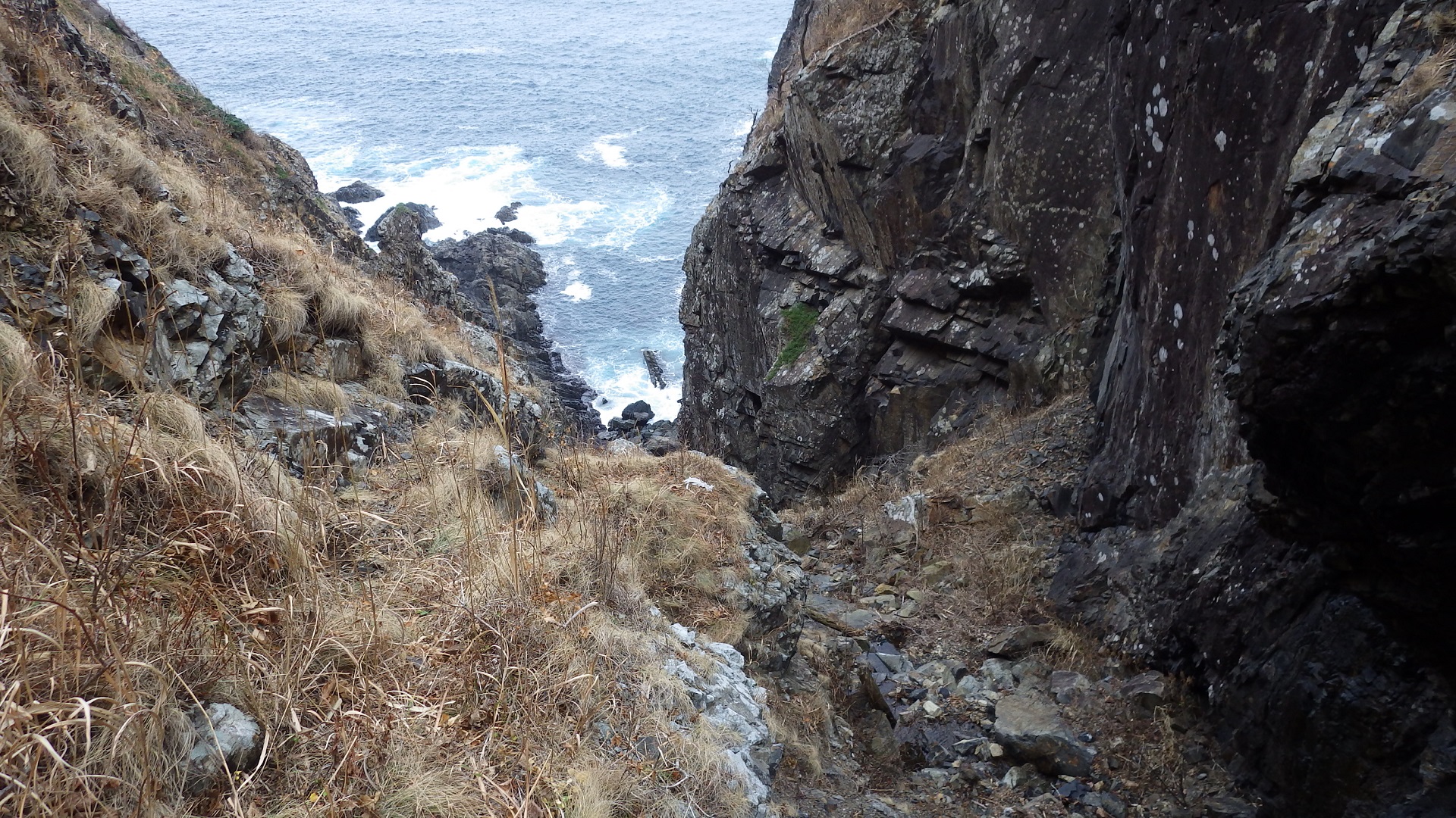 周りにロープを張れる木もなく30分以上かけて降りてきた断崖を諦めて引き返したポイント。