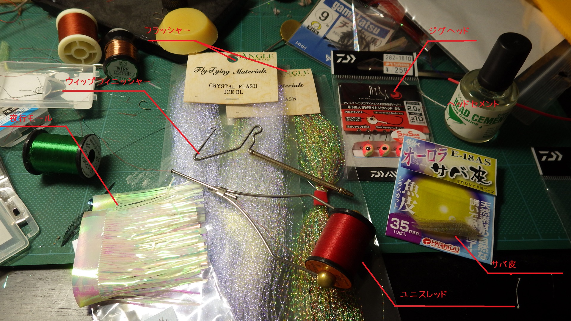 フラッシャー、夜行モールの順に巻いて一番上にサバ皮巻いて最後に一応ヘッドセメントで固めて終わり。