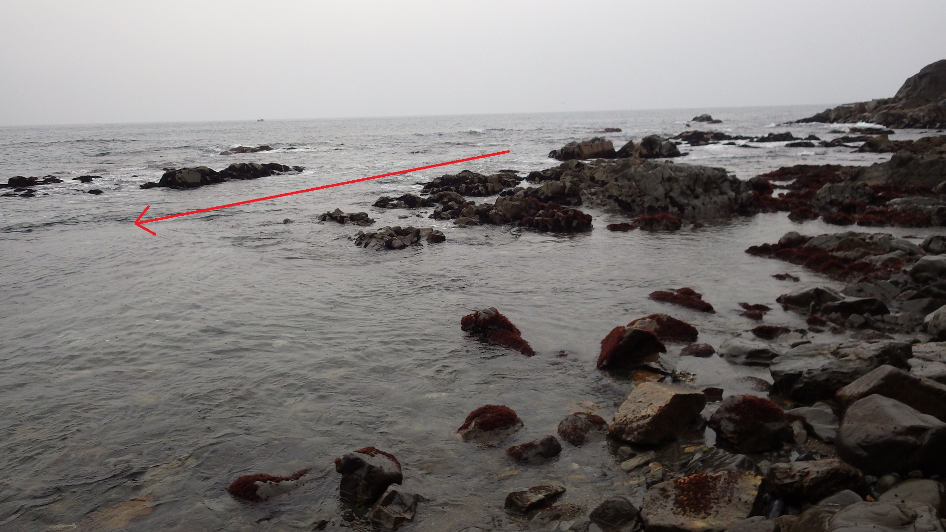 こんな感じのドシャローでやってたんですが、赤線のラインみたいな潮の抜け道で川のように水がゴンゴン流れてる所でヒット。