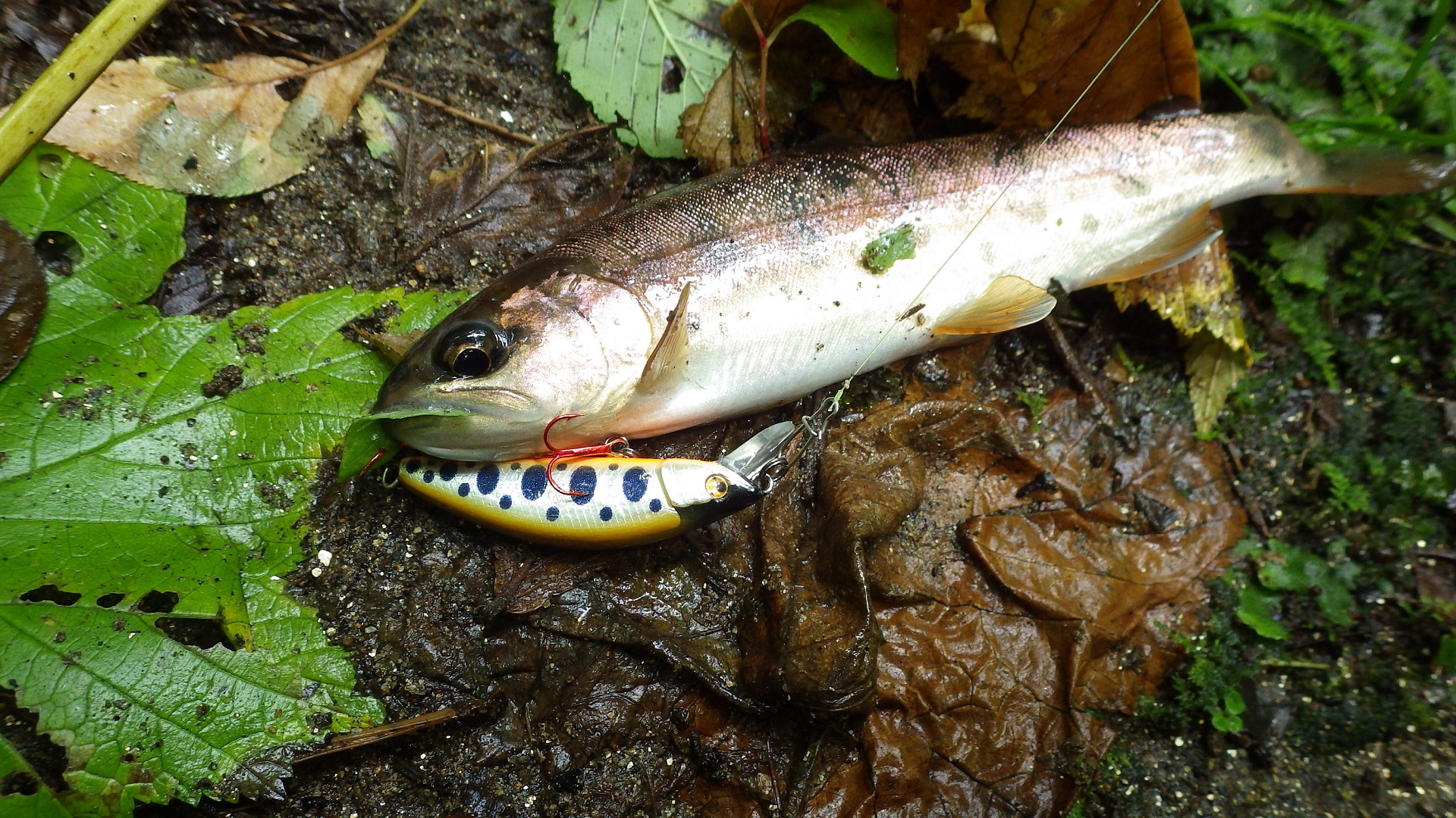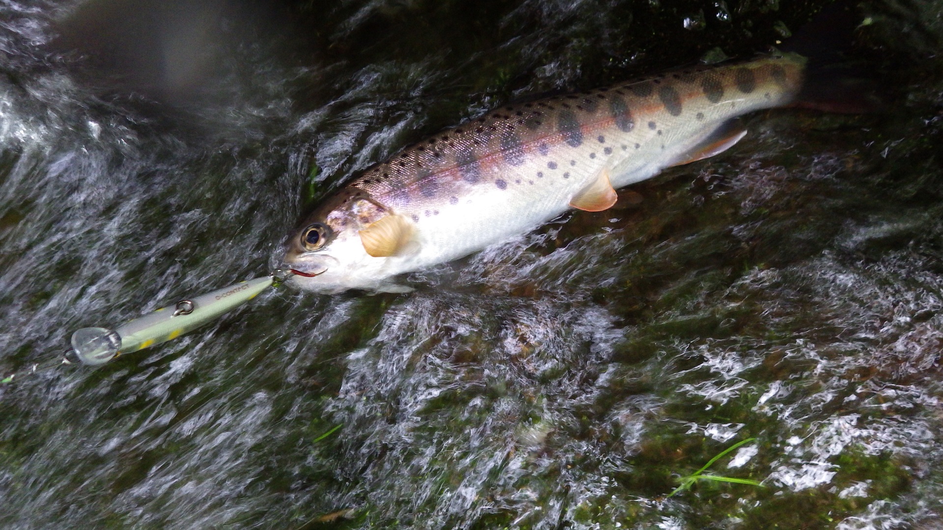 対岸の流芯を挟んだ流れの緩いところへルアーを投げてみると、小ヤマメが警戒しながらもアタックしてくる。